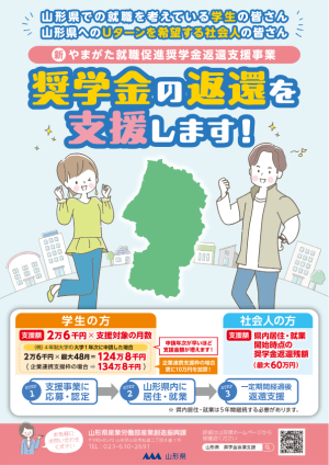 奨学金の返還を支援します! やまがた就職促進奨学金返還支援事業 山形県の将来の担い手となる若者の県内回帰・定着を促進するために、奨学金の貸与を受ける大学生等やUターンを希望する社会人の方が、県内に定住・就業した場合に奨学金の返還を支援します。 詳細は、⇊こちらのページでご確認ください。 やまがた就職促進奨学金返還支援事業 | 山形県