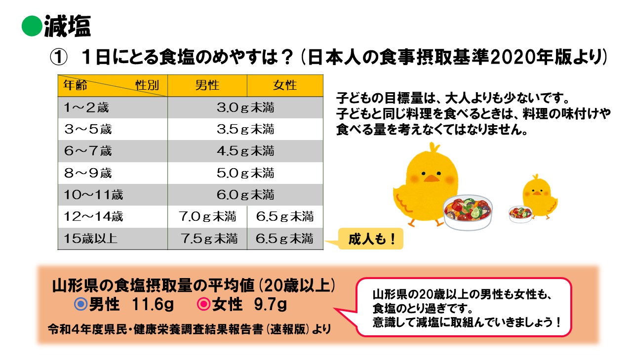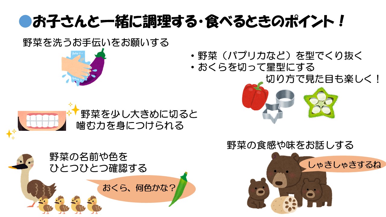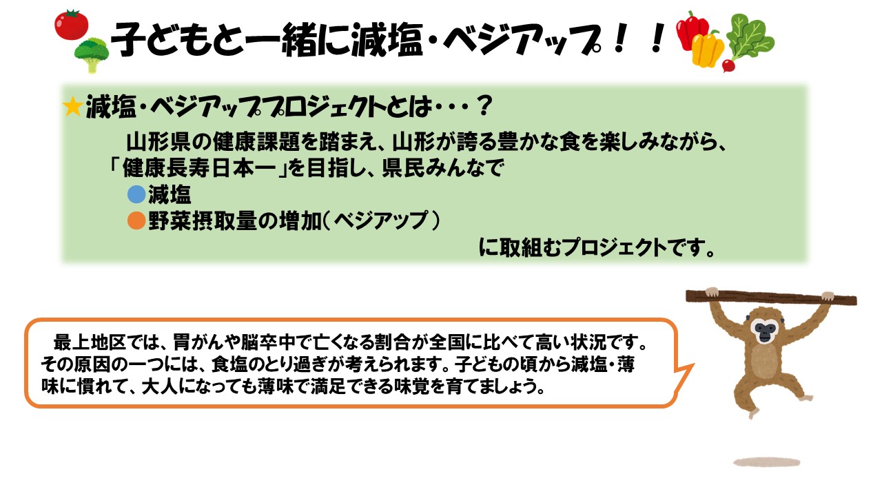 お子さんの将来の生活習慣病を予防するためには、今から薄味に慣れることが大切です。お子さんと一緒に料理しながら、減塩とベジアップに取り組んでみませんか。