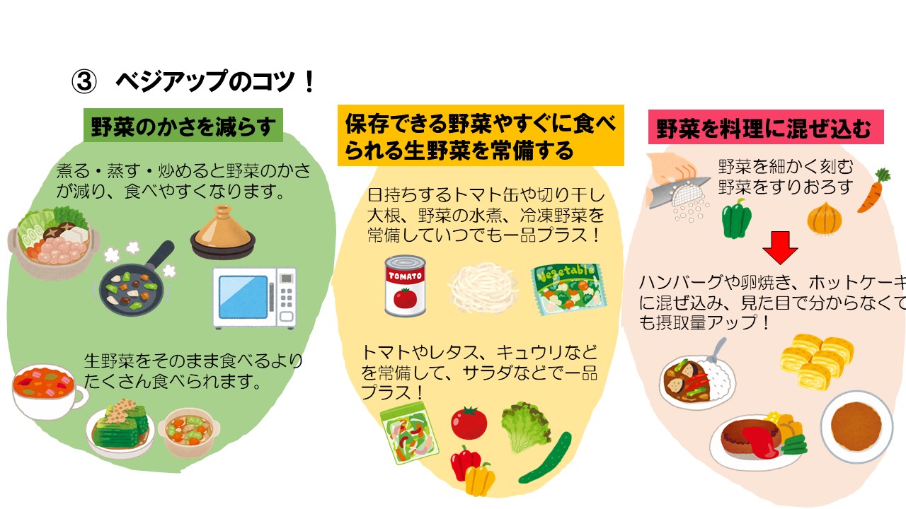 県では、毎日の健康づくりに役立てていただくため、減塩・べジアップレシピを掲載しています。ぜひ毎日の献立にご活用下さい。