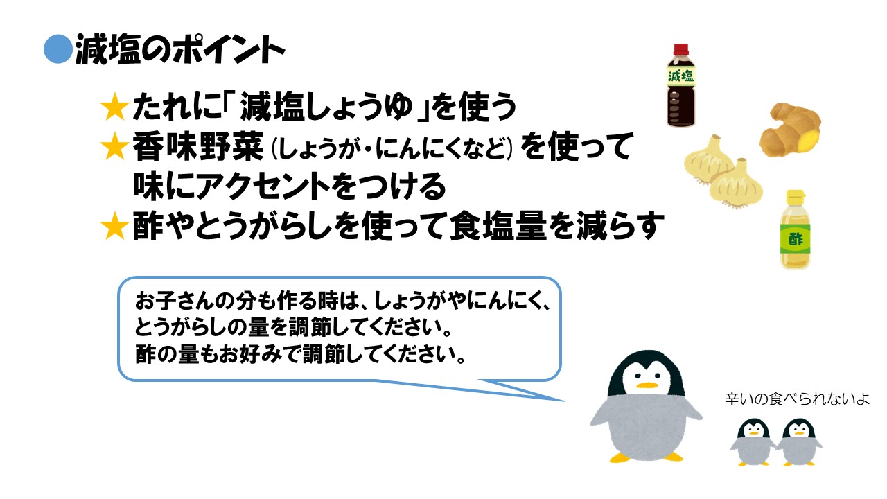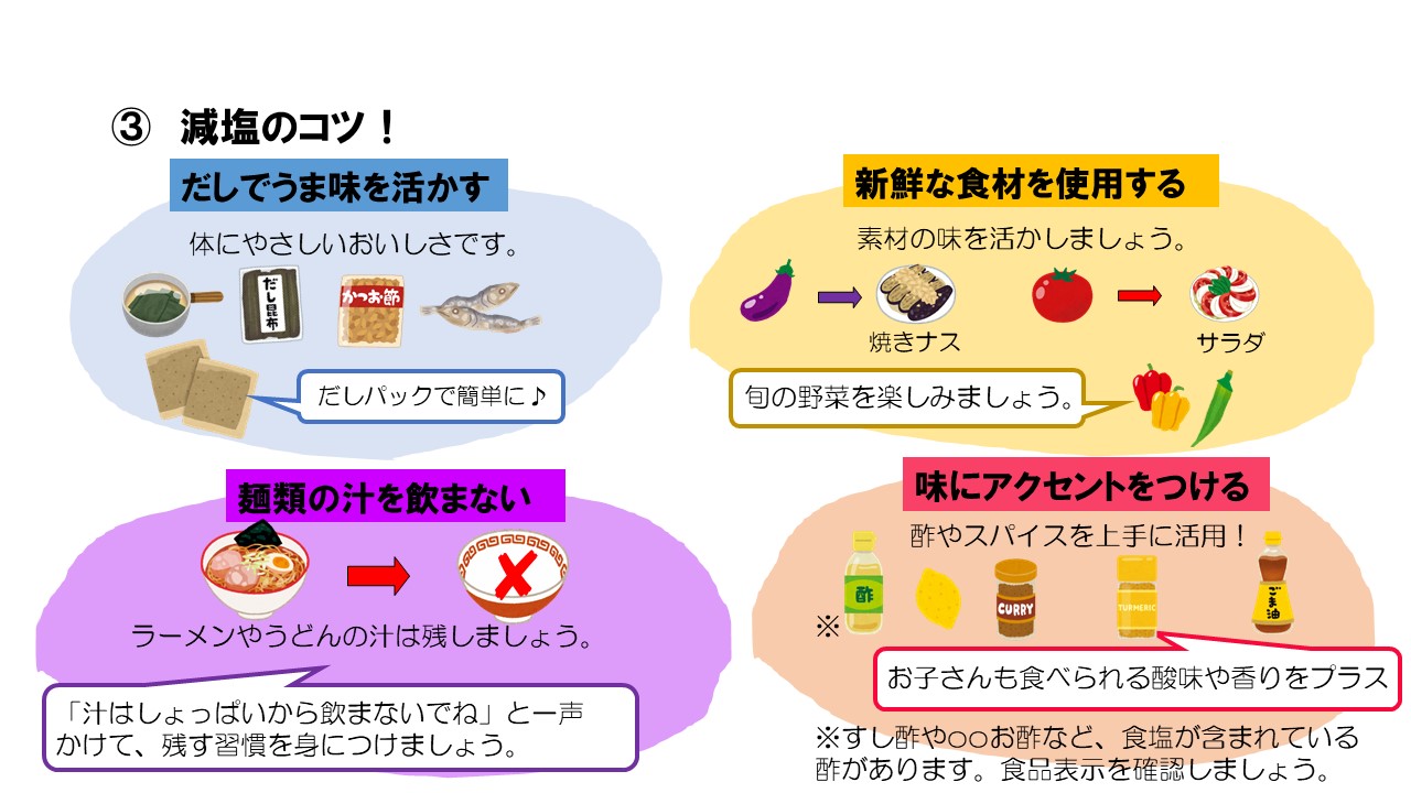 お子さんの将来の生活習慣病を予防するためには、今から薄味に慣れることが大切です。お子さんと一緒に料理しながら、減塩とベジアップに取り組んでみませんか。